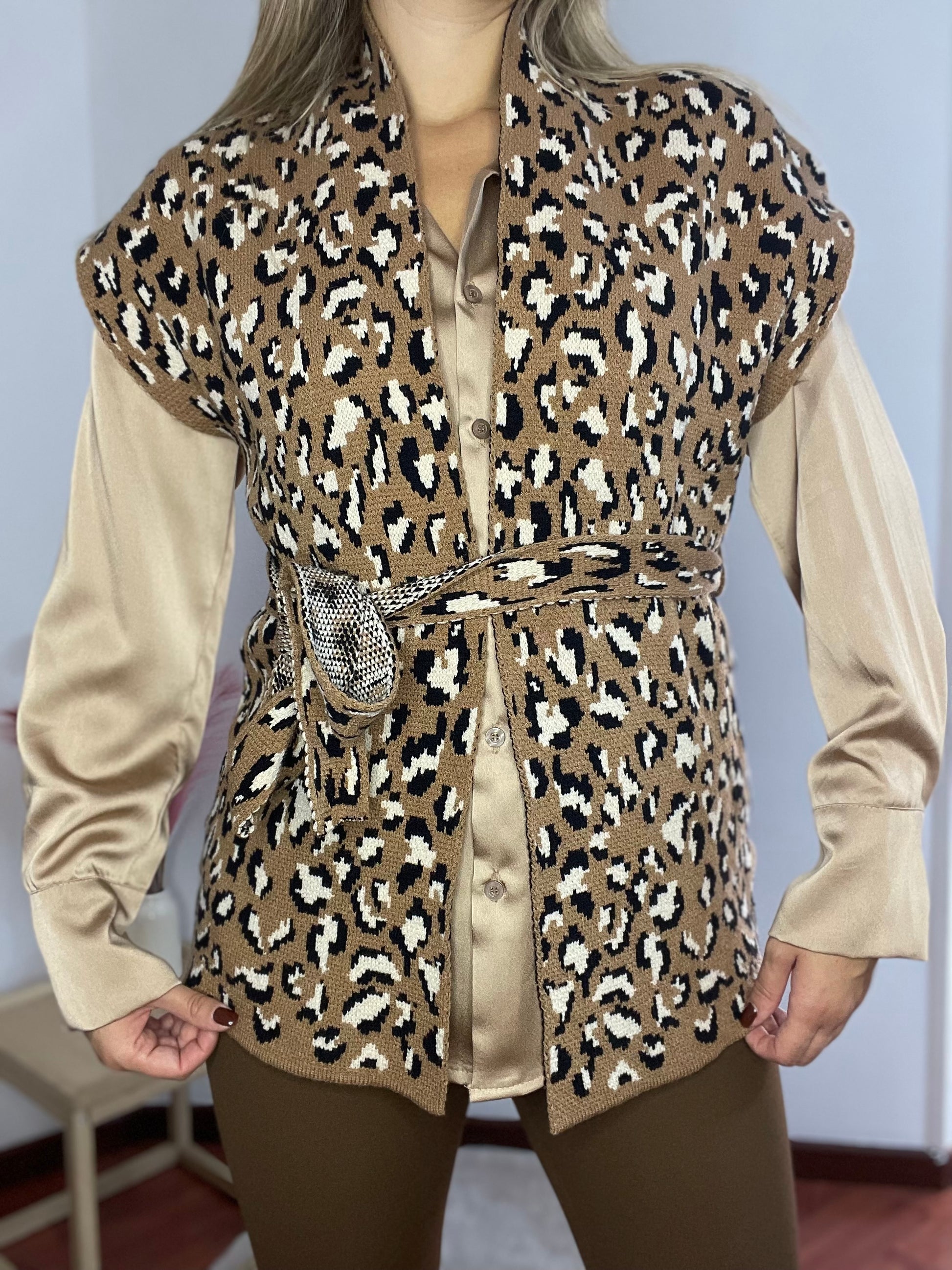 Gilet leopardato, rimane aperto ma si può chiudere ci cinturino dello stesso tessuto.