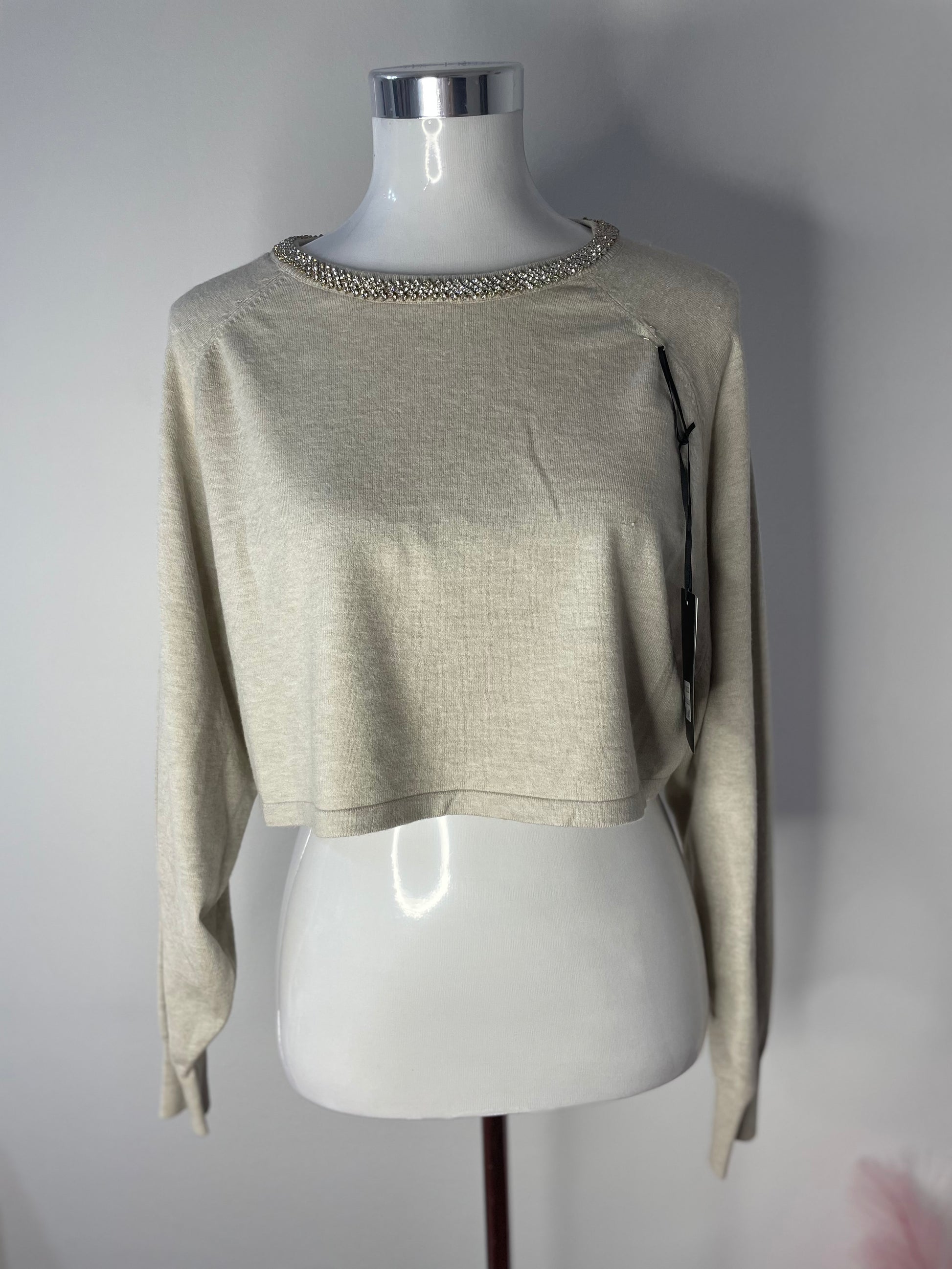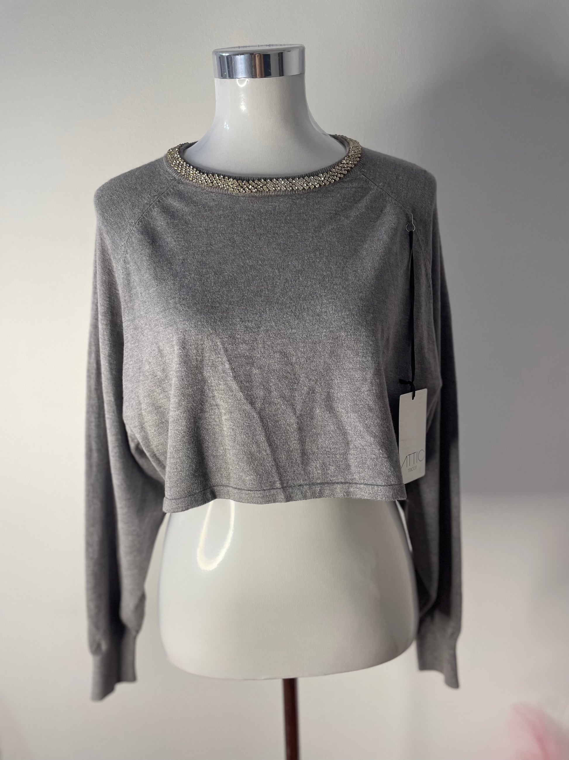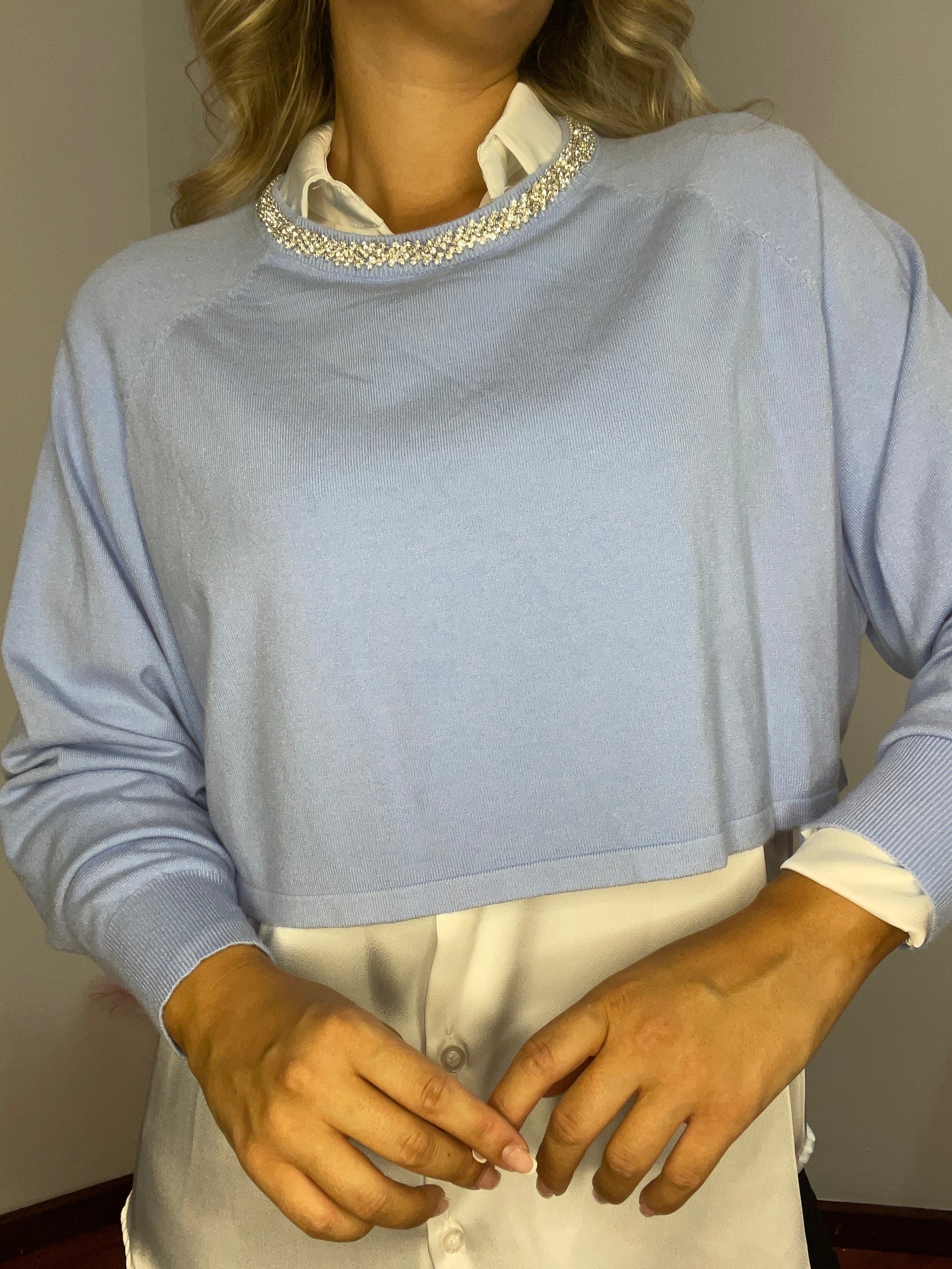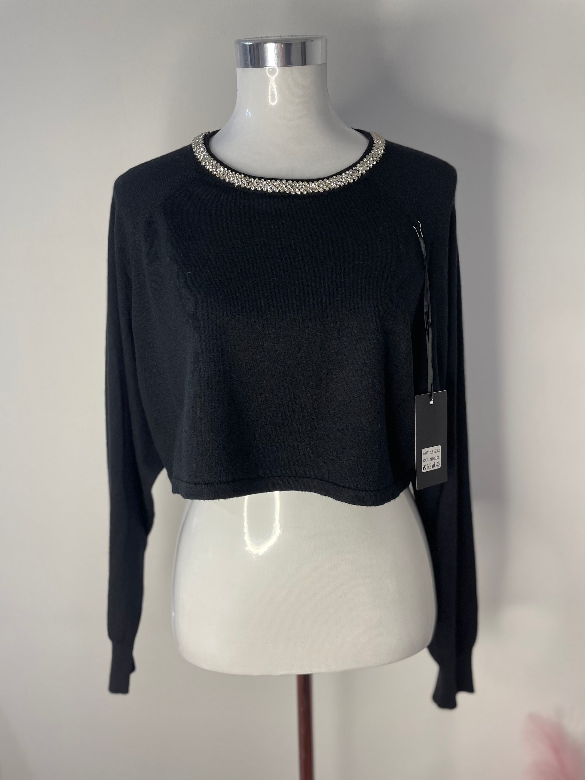 Maglione crop con brillanti sul girocollo applicati.